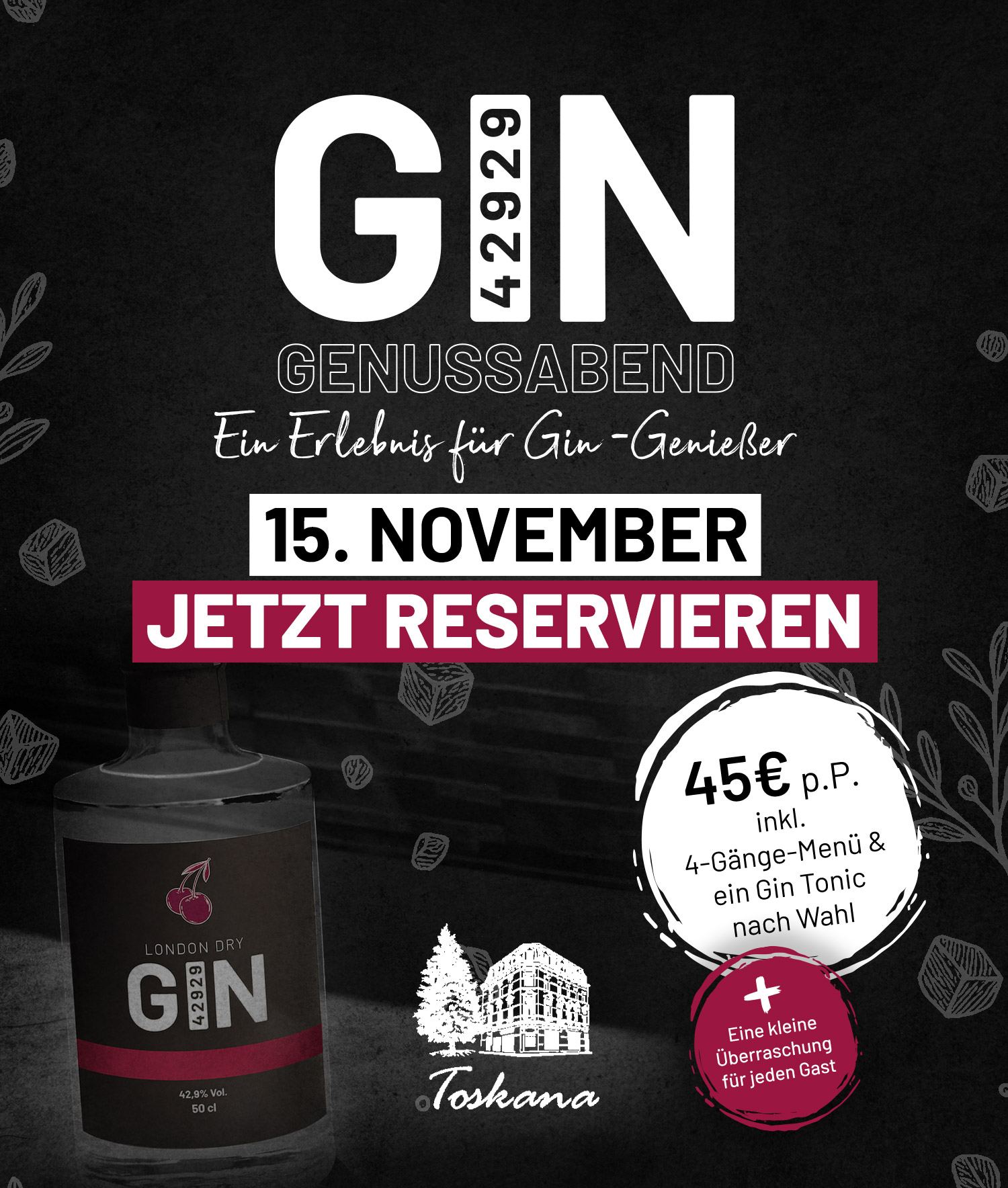 Am 15. November laden wir euch herzlich zum GIN 42929 Genussabend im Restaurant Toskana in Wermelskirchen ein.